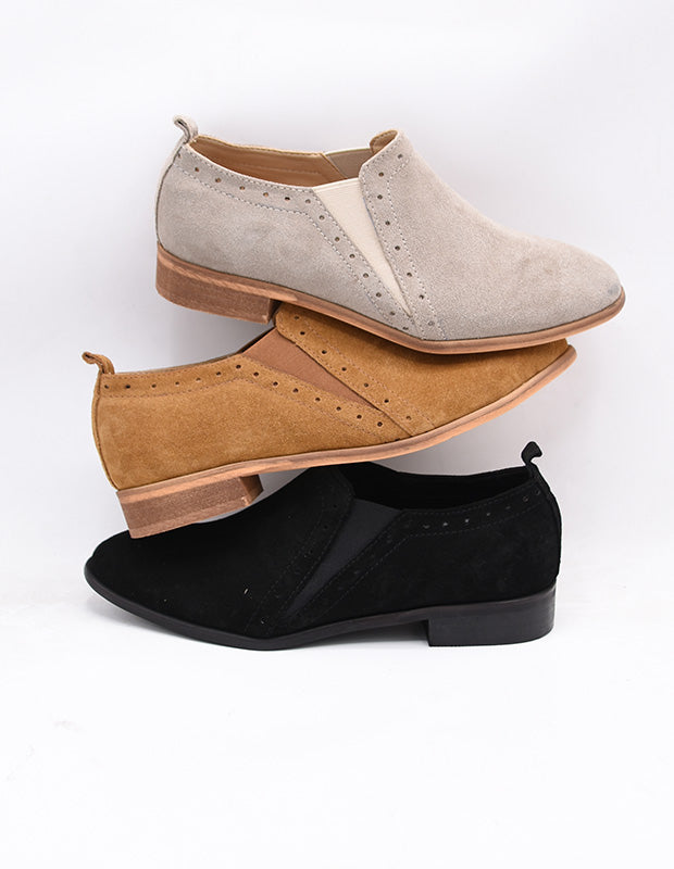 נעל שטוחה ונוחה עשויה מזמש רך, בעיצוב נקי ואלגנטי. כוללת גומי בצידי הנעל להתאמה מושלמת ולנעילה קלה, מתאימה ליום-יום ולמראה קז'ואלי מתוחכם.נעל סירה מהממת