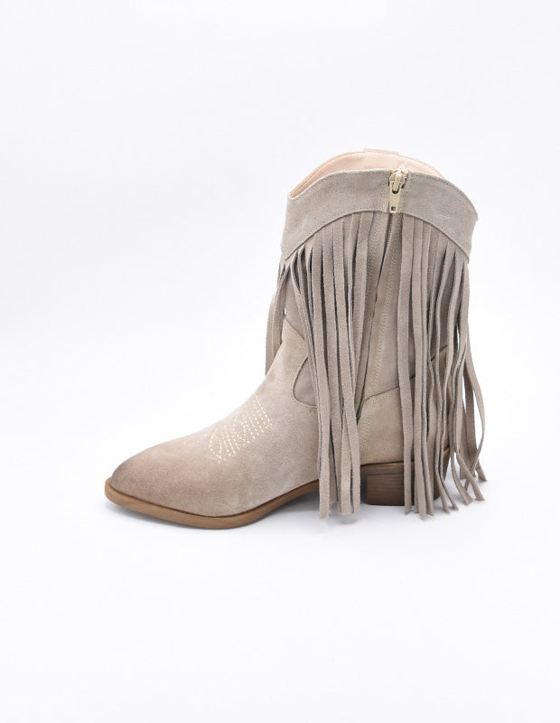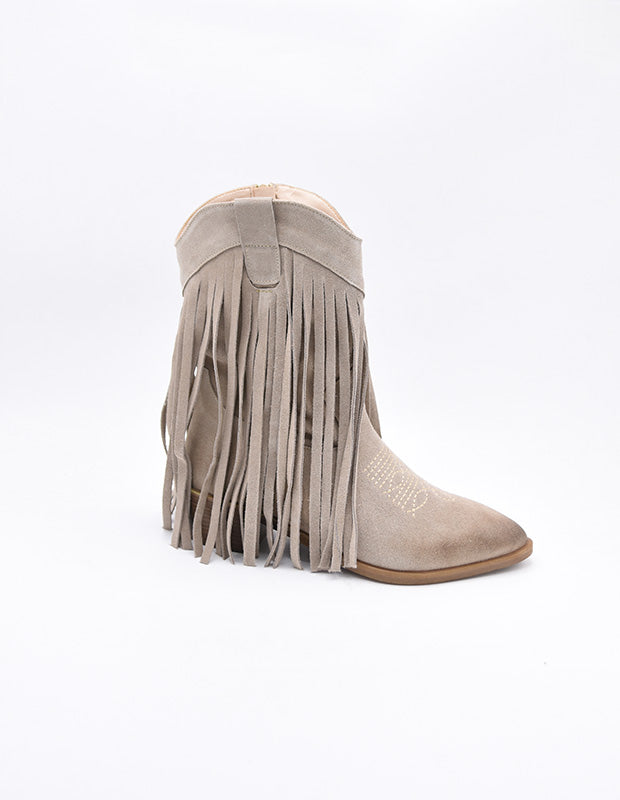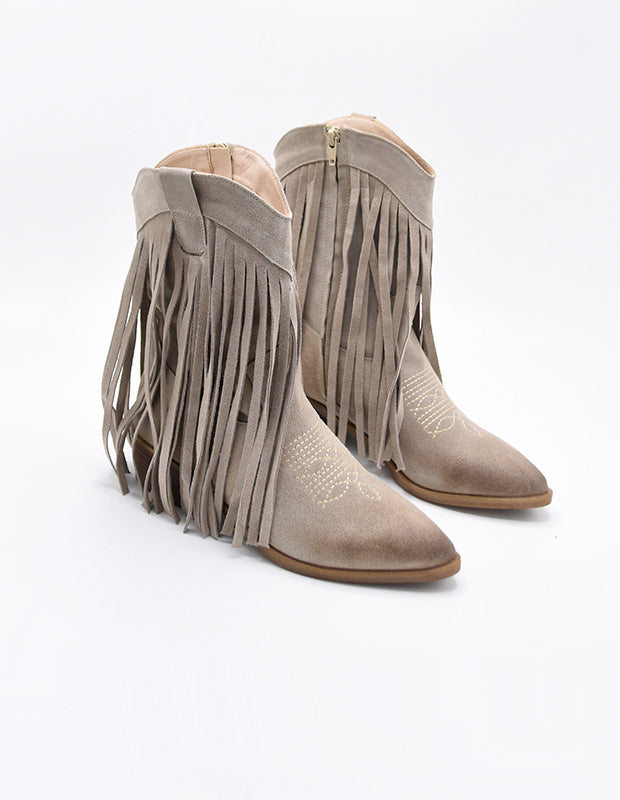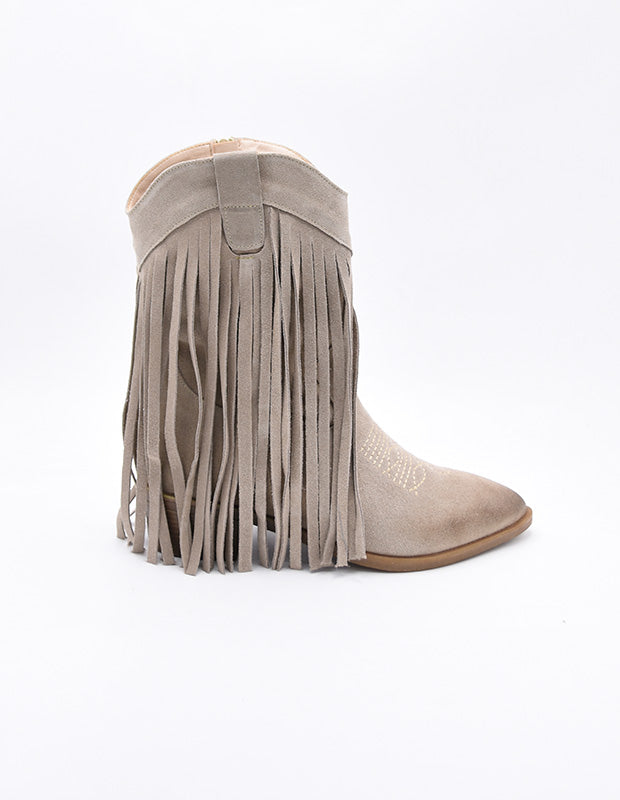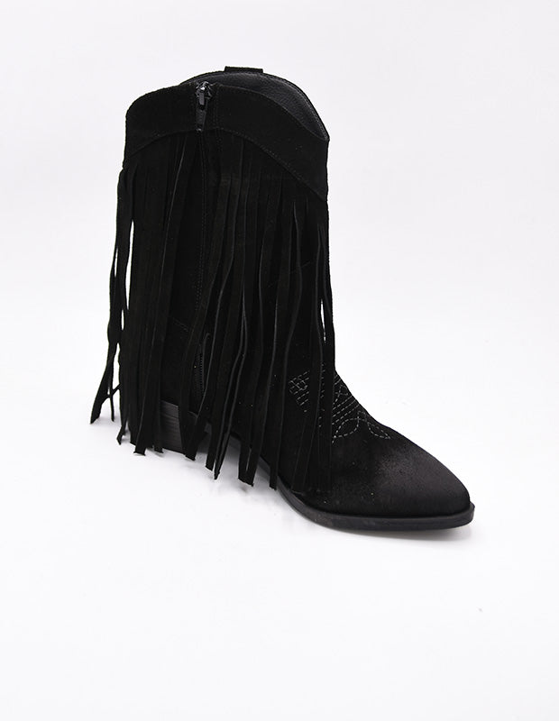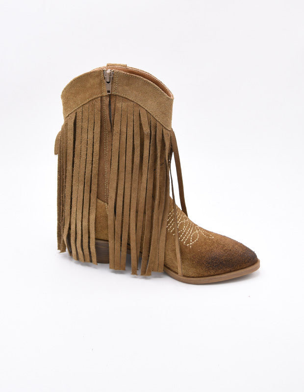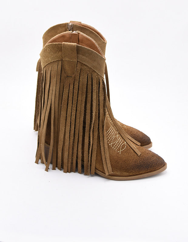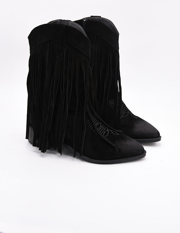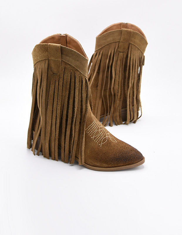מגף בוהו־שיק בגזרת מערבונים, עשוי זמש רך ומעוצב עם שכבות פרנזים ארוכות המתנועעות עם כל צעד.