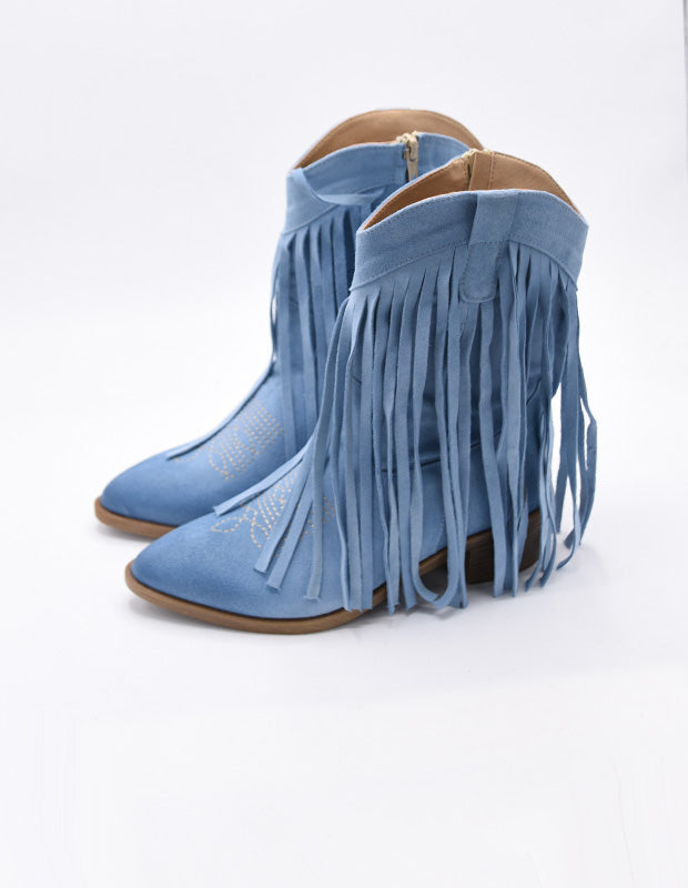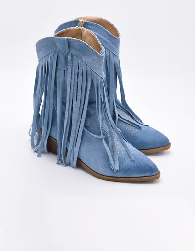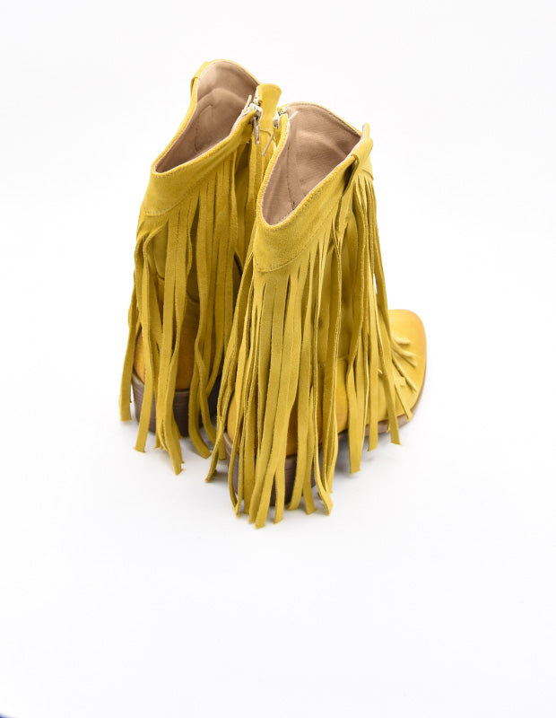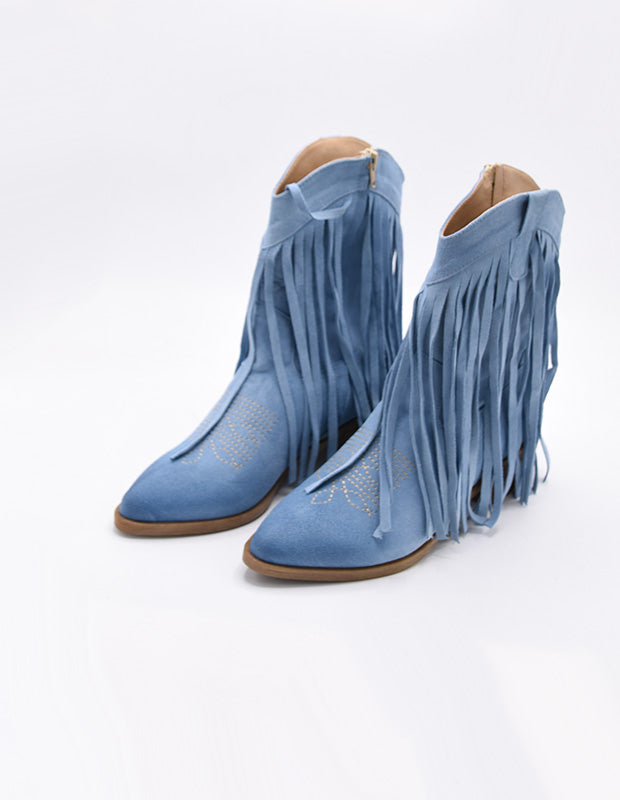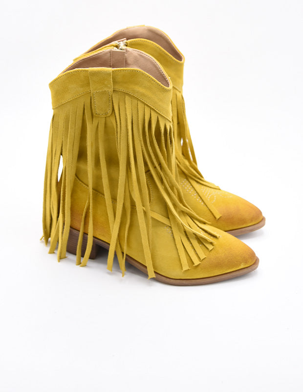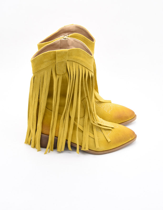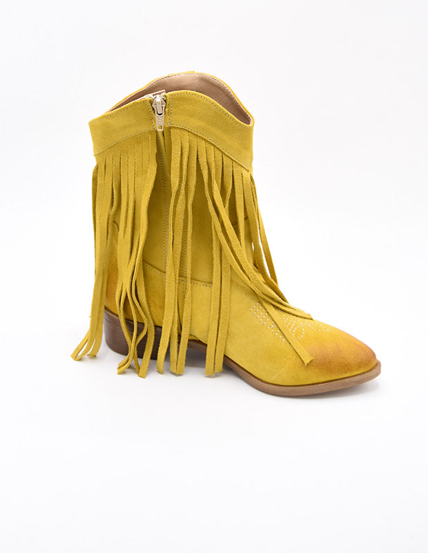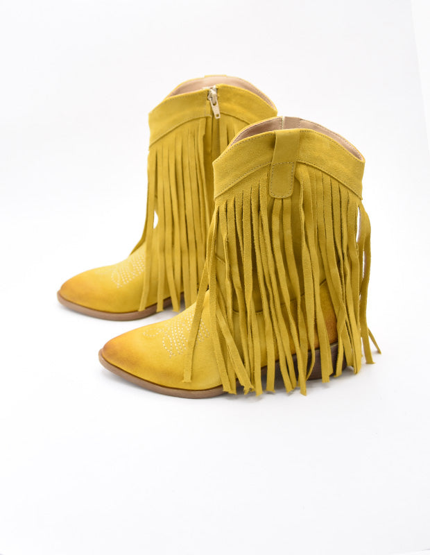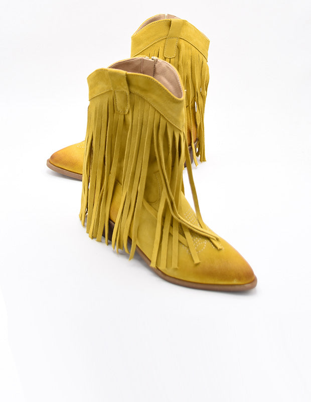 מגף בוהו־שיק בגזרת מערבונים, עשוי זמש רך ומעוצב עם שכבות פרנזים ארוכות המתנועעות עם כל צעד.