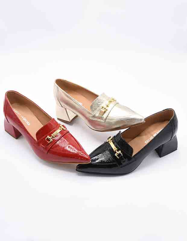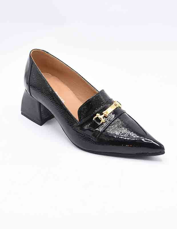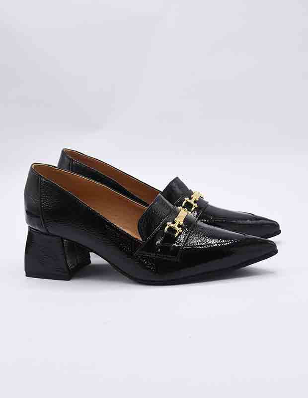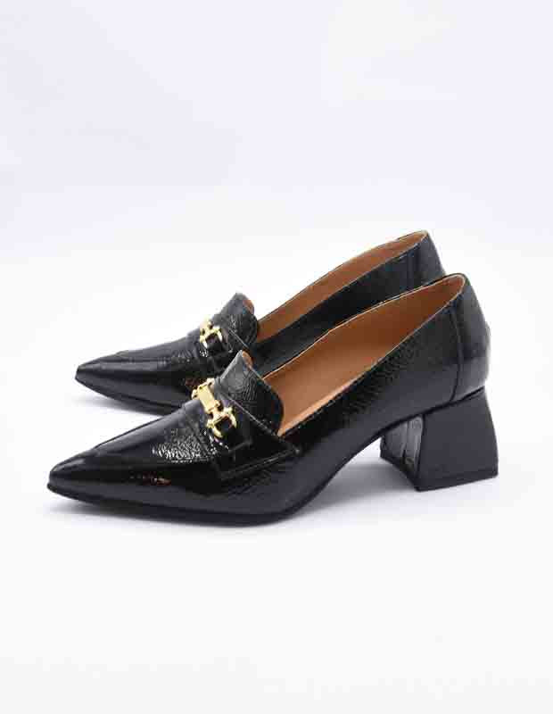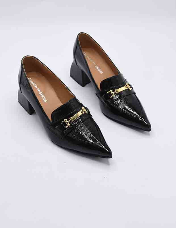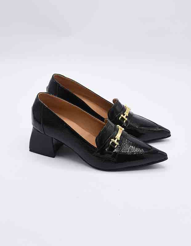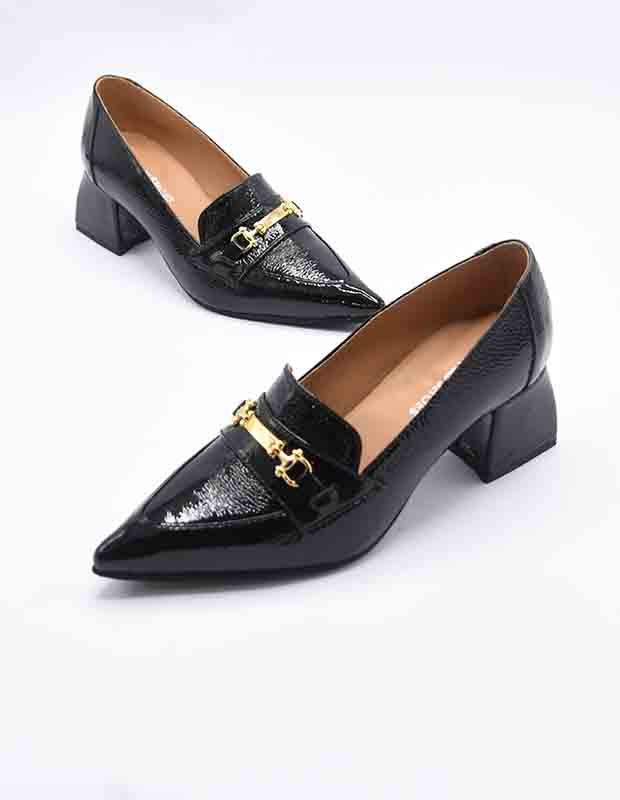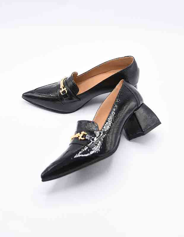 נעל עקב מחודדת שמשלבת אלגנטיות ונוכחות עם נוחות יומיומית. עשויה עור לכה איכותי במרקם מבריק ומוקפד, עם גימור מתכתי מוזהב בחזית שמוסיף טאצ' יוקרתי ומודרני.