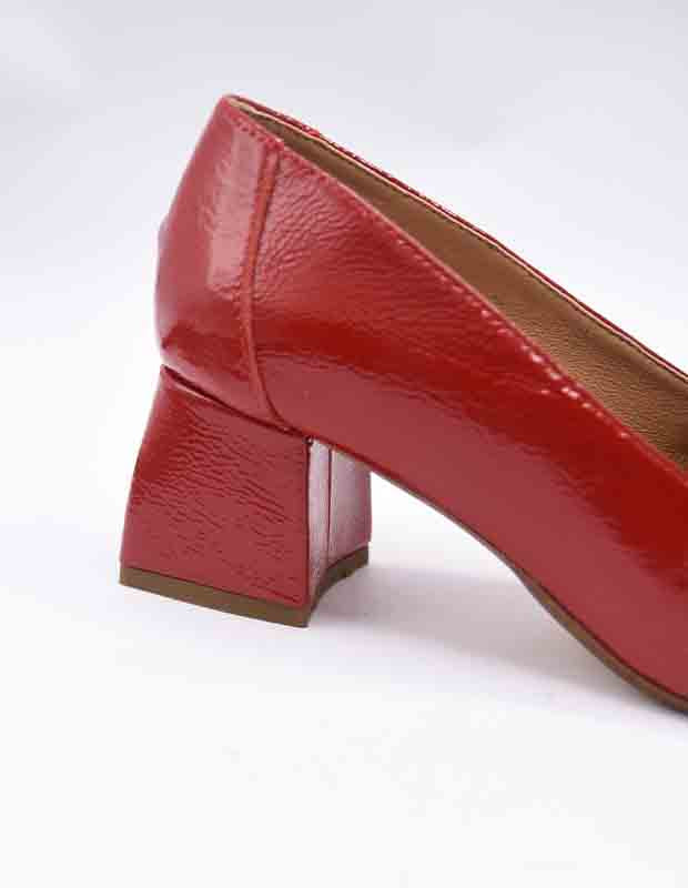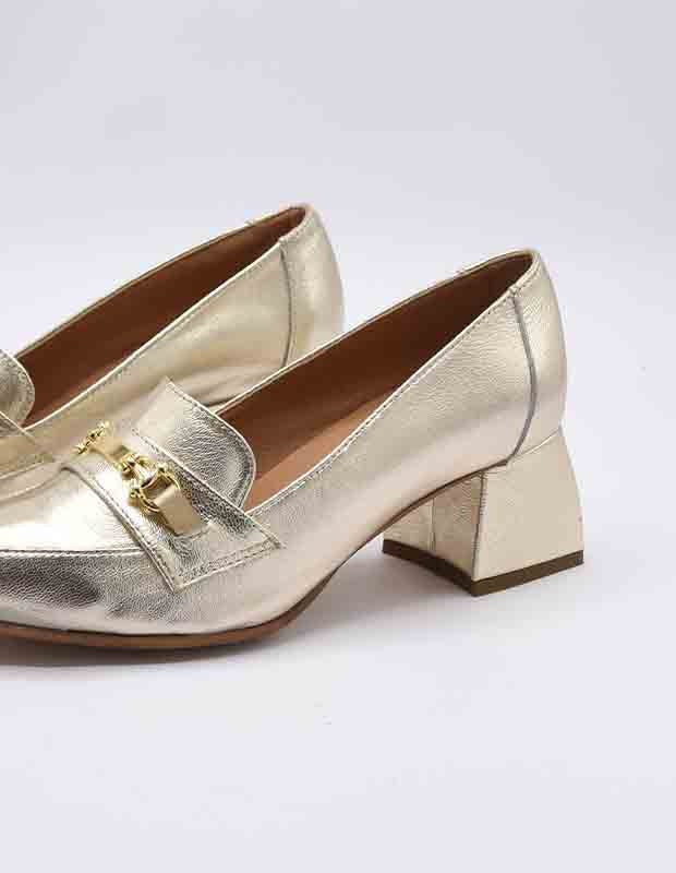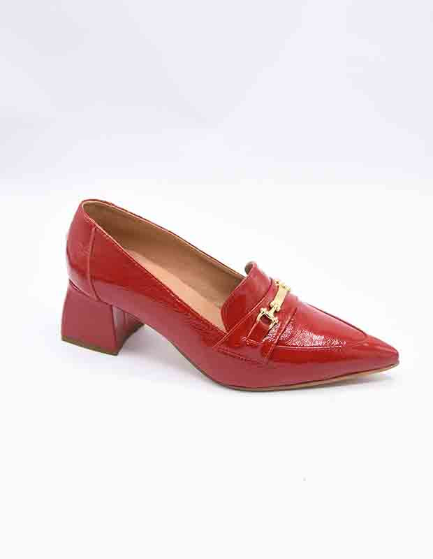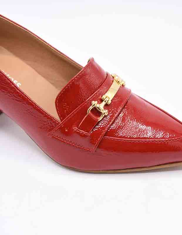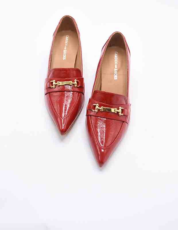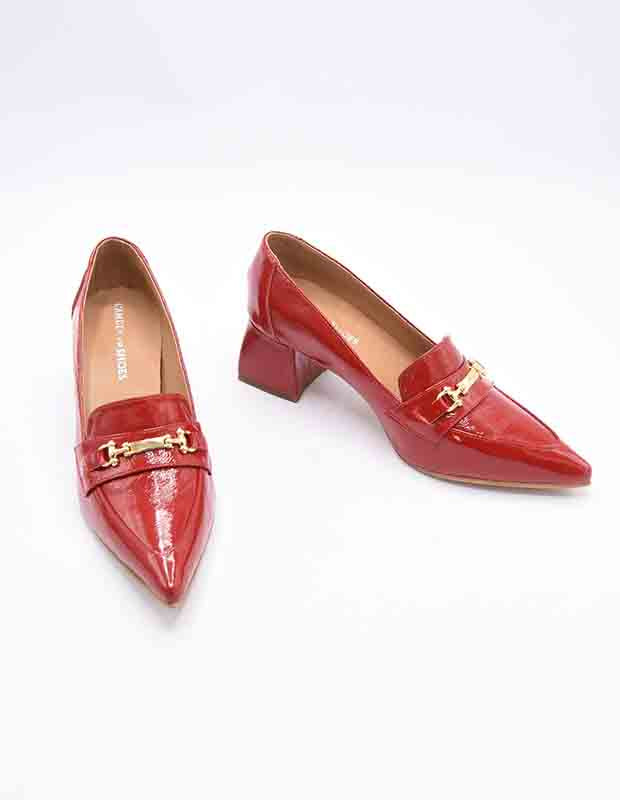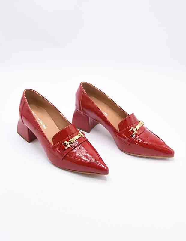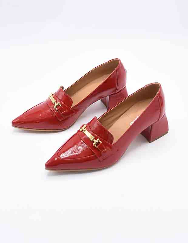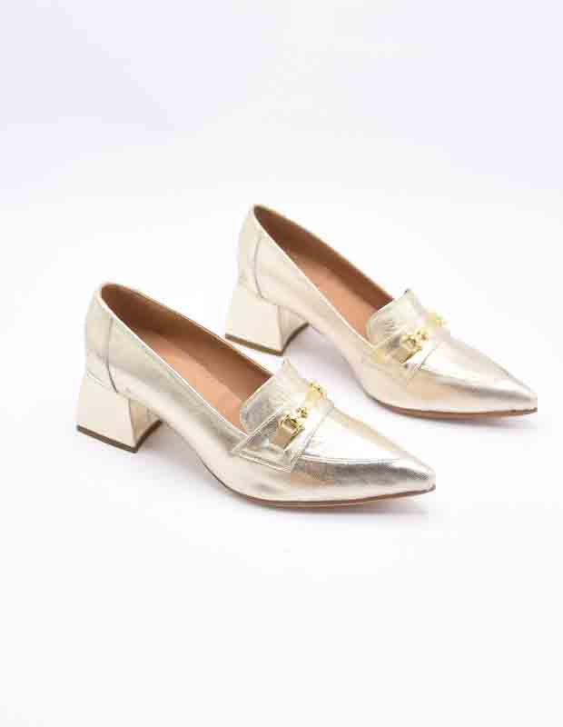 נעל עקב מחודדת שמשלבת אלגנטיות ונוכחות עם נוחות יומיומית. עשויה עור לכה איכותי במרקם מבריק ומוקפד, עם גימור מתכתי מוזהב בחזית שמוסיף טאצ' יוקרתי ומודרני.