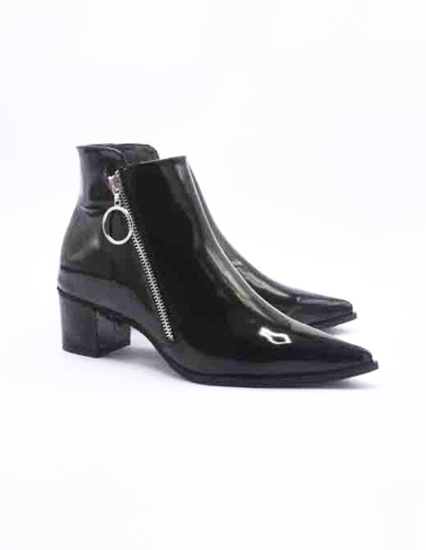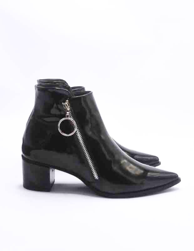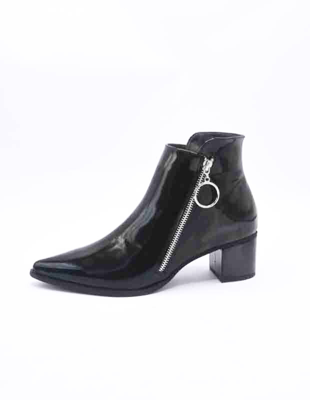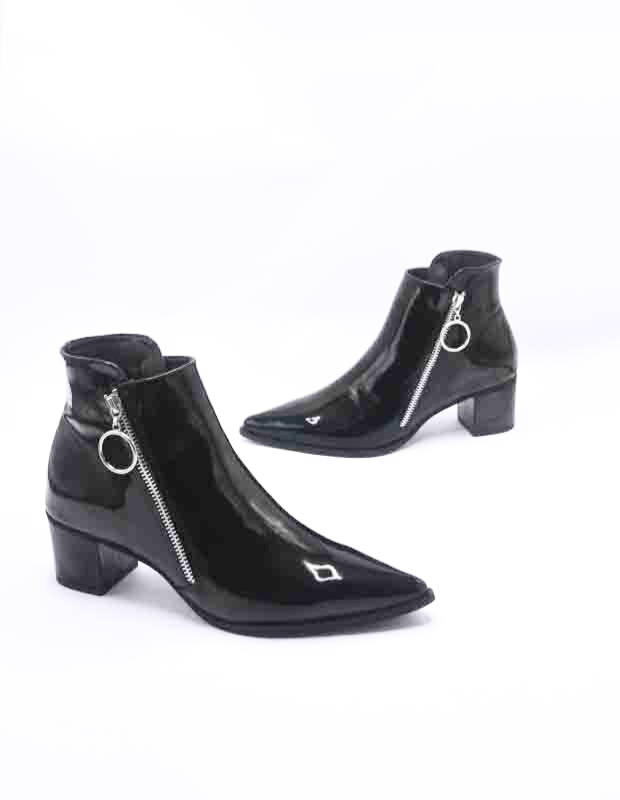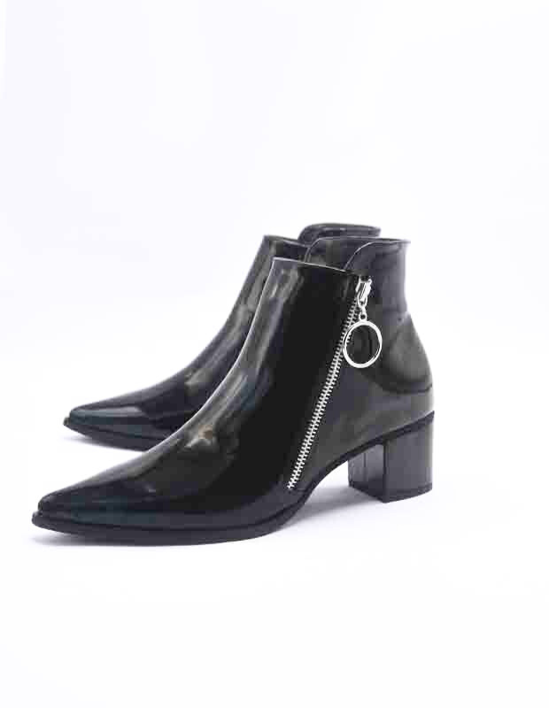 מגפון שחור בוהק עם גזרה חד־מודרנית ורוכסן קדמי מעוצב בטבעת מתכת — פריט שמכניס דרמה ושיק לכל לוק.