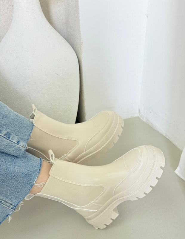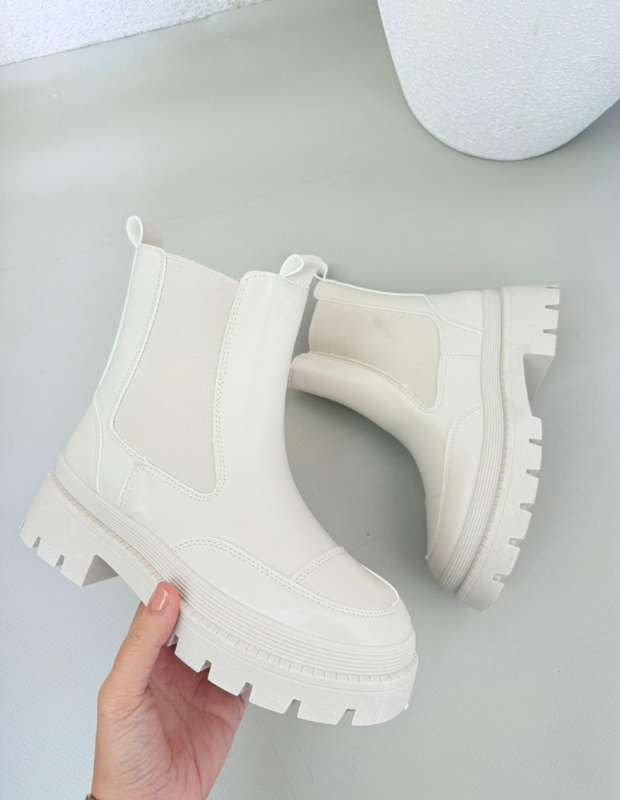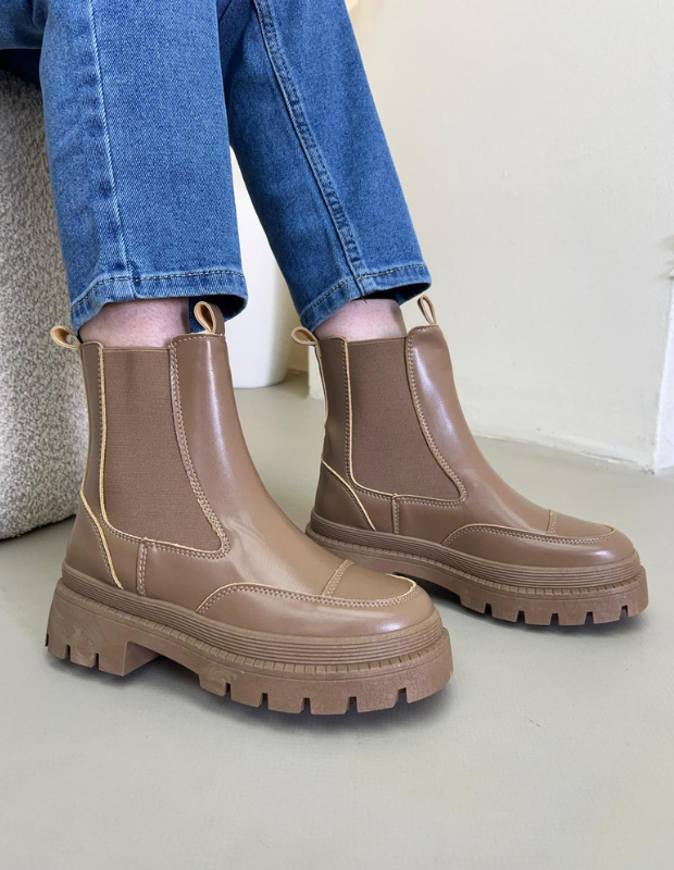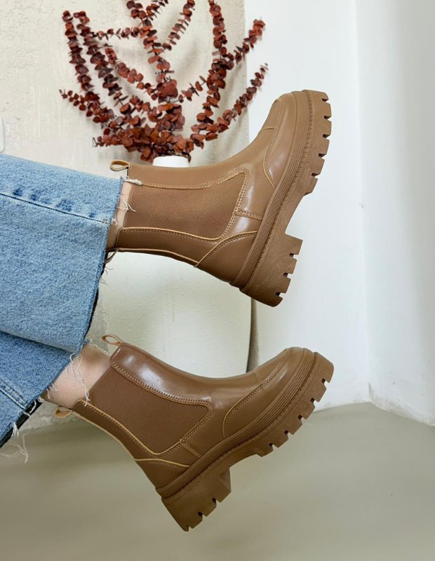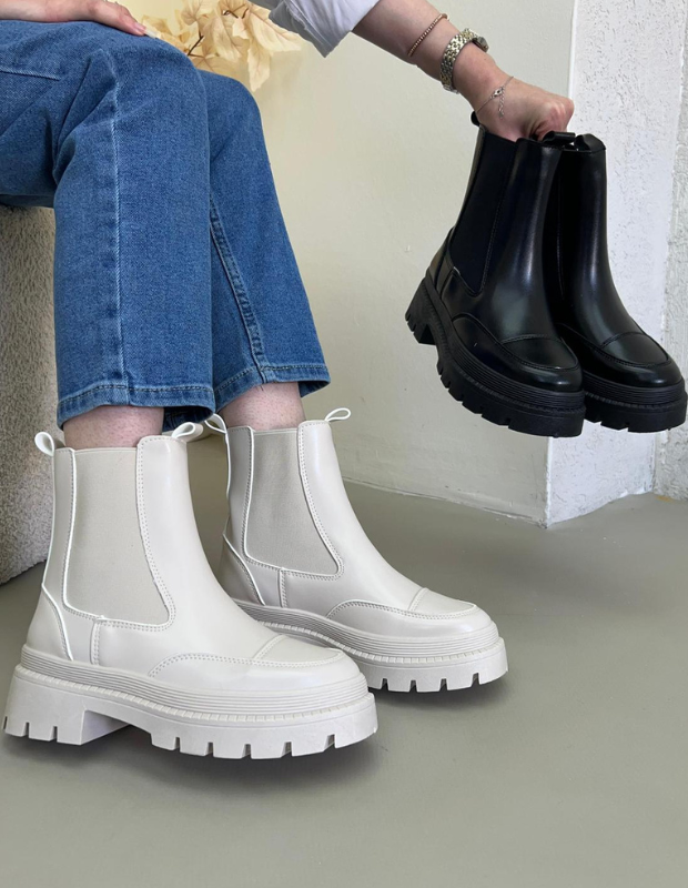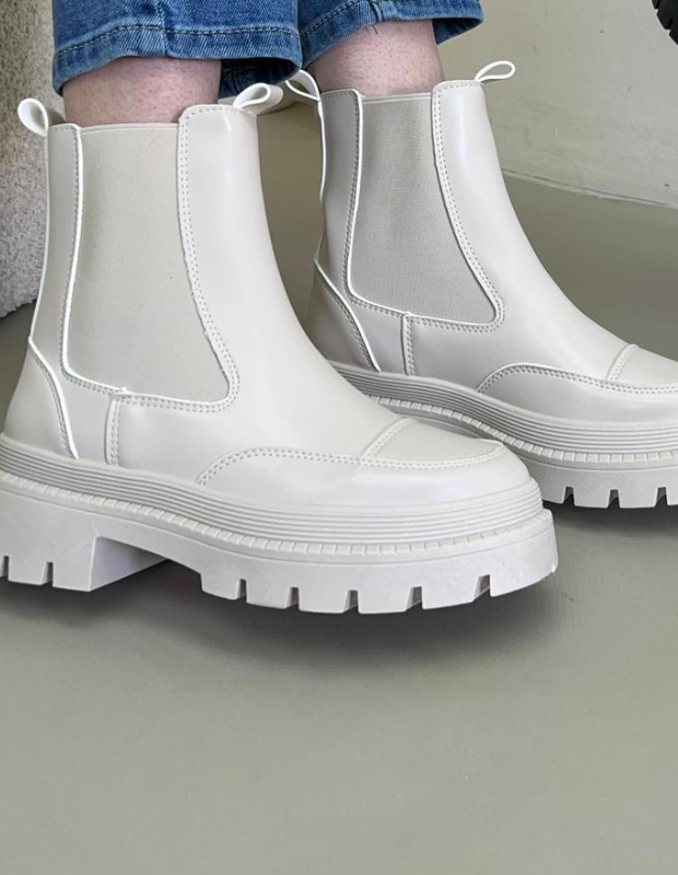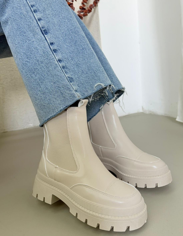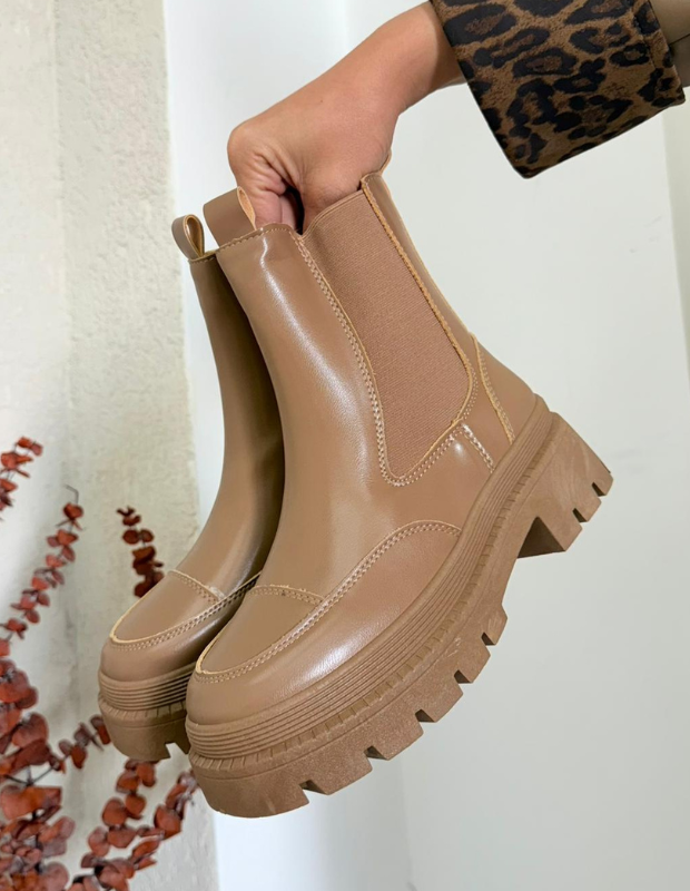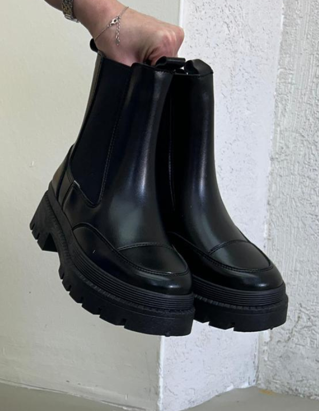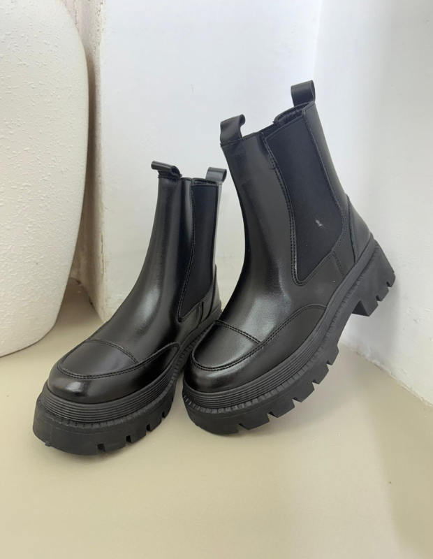 מגפון צ'לסי בעיצוב עכשווי ונקי, עשוי חומר דמוי עור יוקרתי בגימור מבריק עם שילובי אלסטיק צדדי למראה אלגנטי ונוחות מרבית.