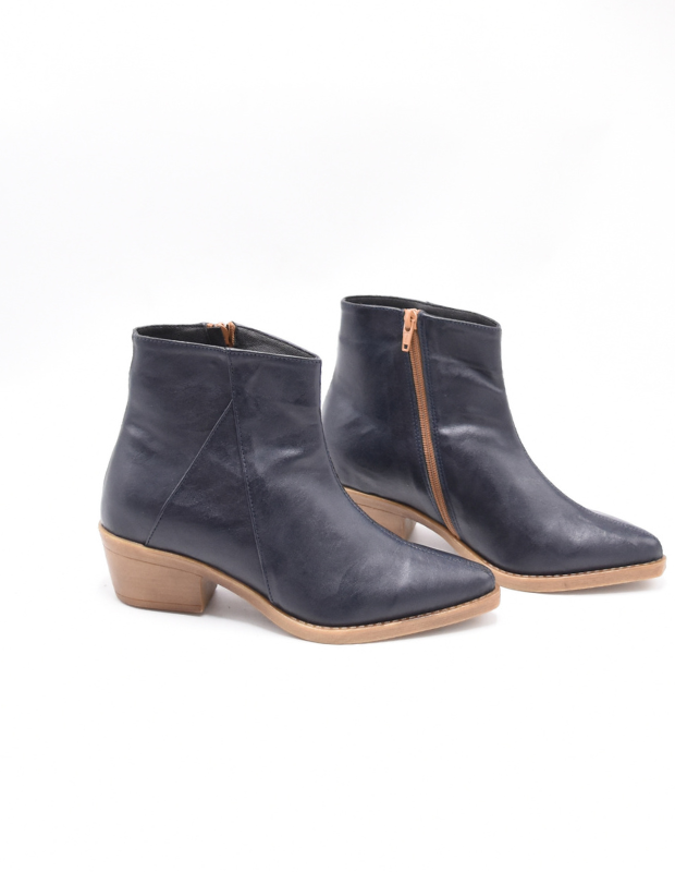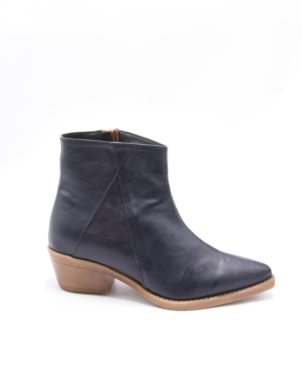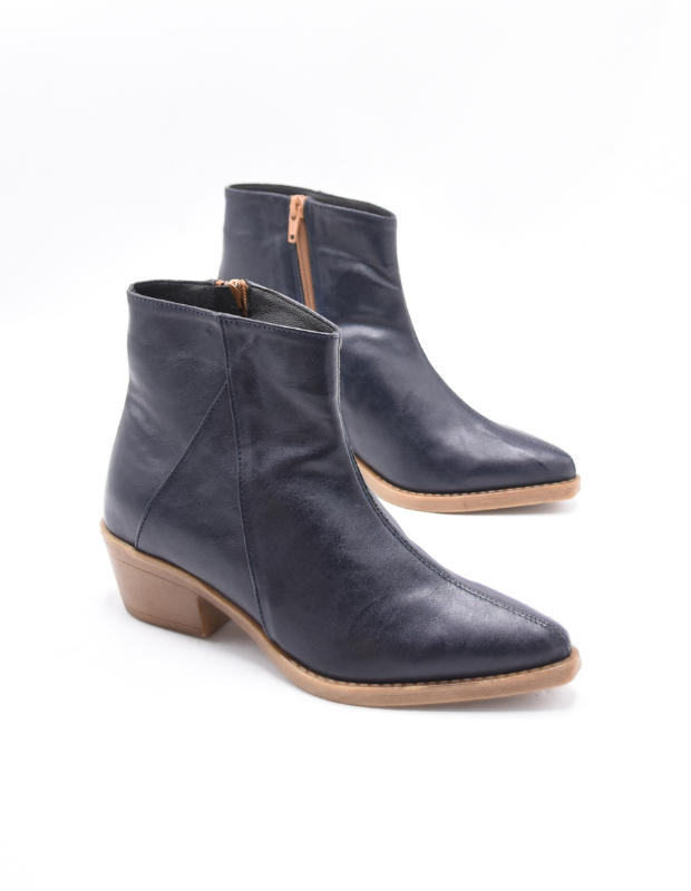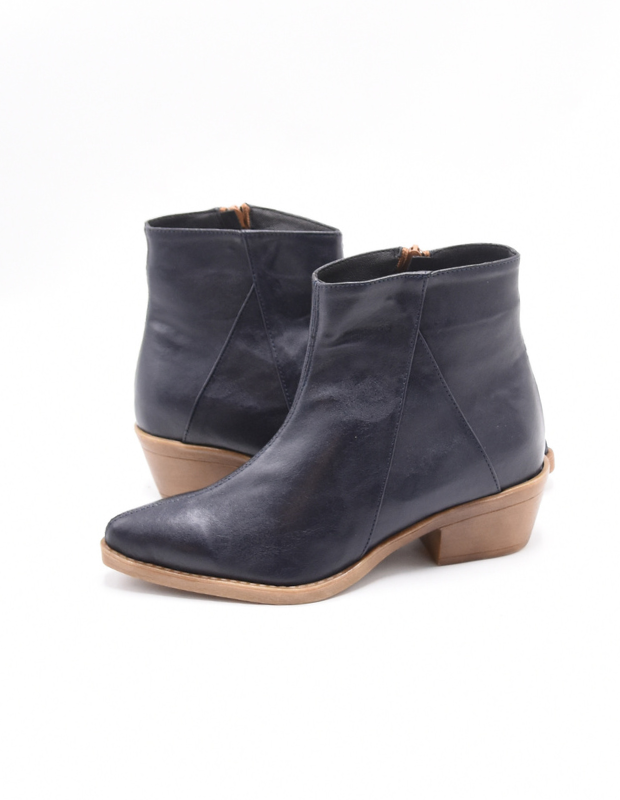 מגפון אלגנטי בעבודת יד, עשוי דמוי עור יוקרתי בגוון כחול-שחור עמוק שמעניק מראה מתוחכם ועל-זמני. גזרה נקייה עם חיתוך עדין ואלכסוני המאריך את הרגל ומחמיא לכל מראה — מג'ינס יומיומי ועד שמלה ערב חגיגית.