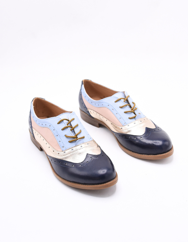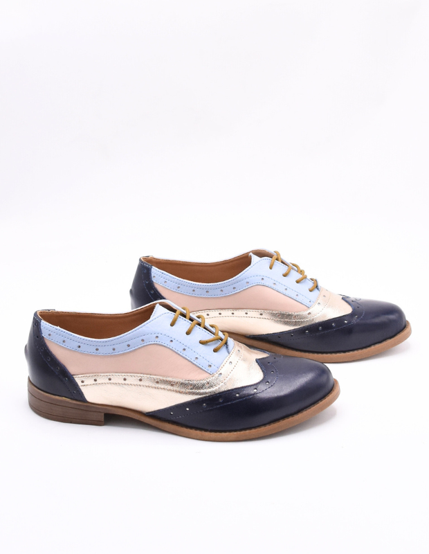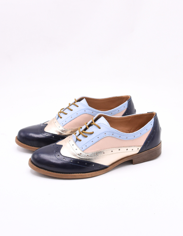 נעל אוקספורד בעבודת יד בעיצוב מיוחד במינו, עם שילוב צבעים אלגנטי של כחול נייבי, שמפניה וזהב בהיר ותכלת רכה.