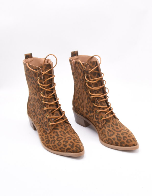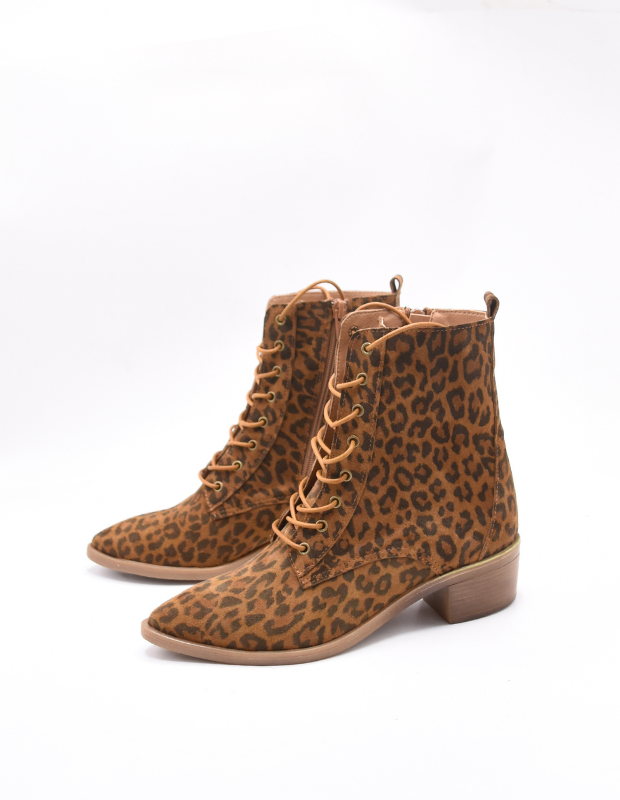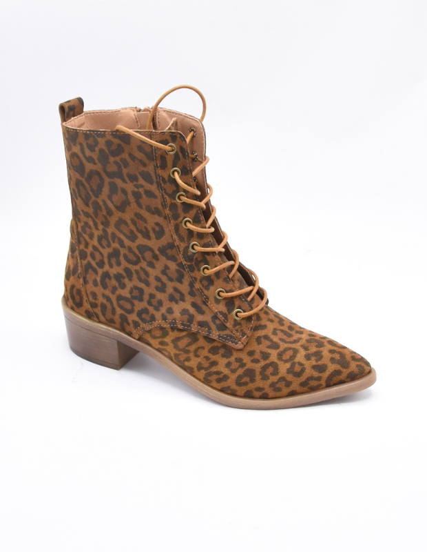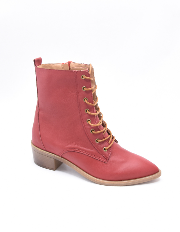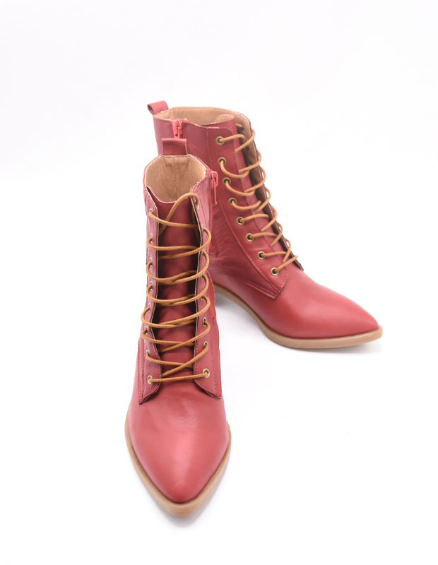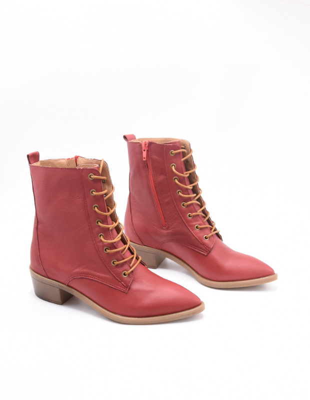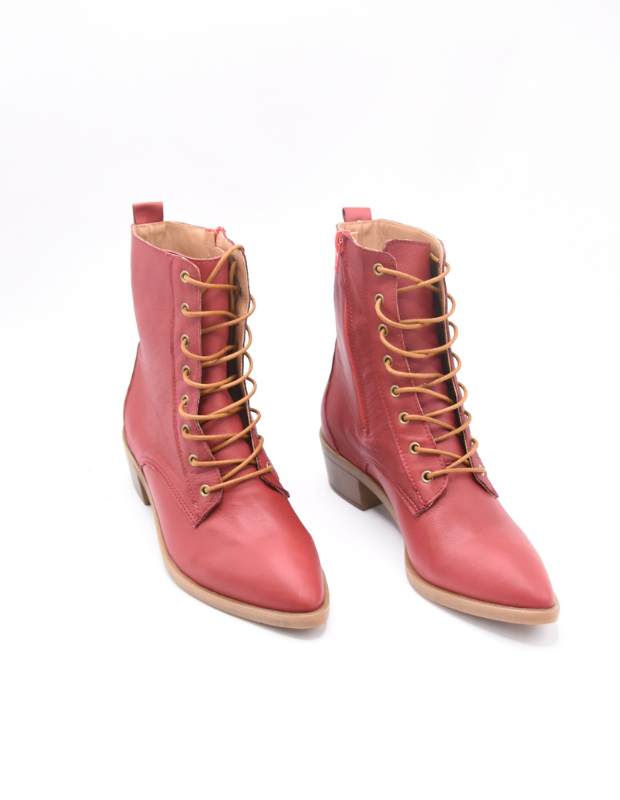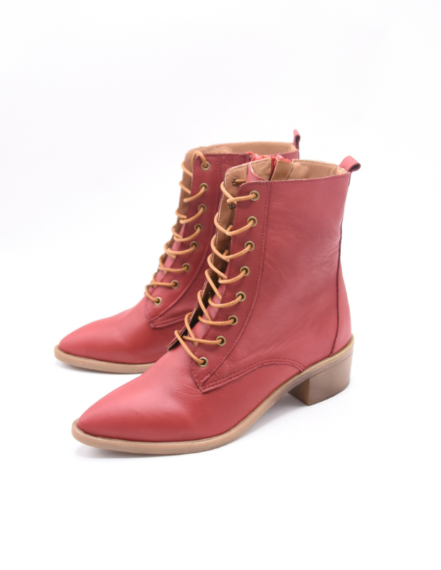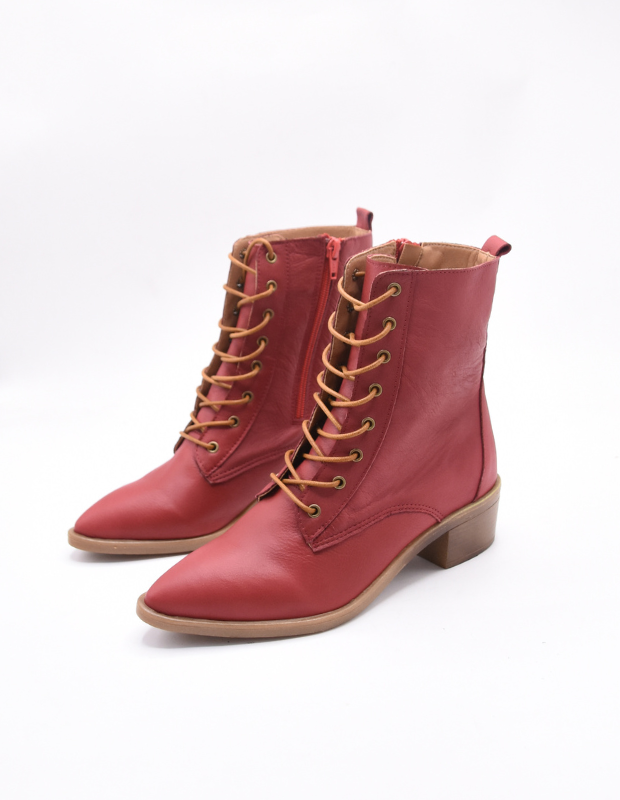 מגפון עור אמיתי בגוון אדום עמוק ונמר משגע עם שרוכים זהובים ונגיעה אלגנטית של וינטג' מודרני.